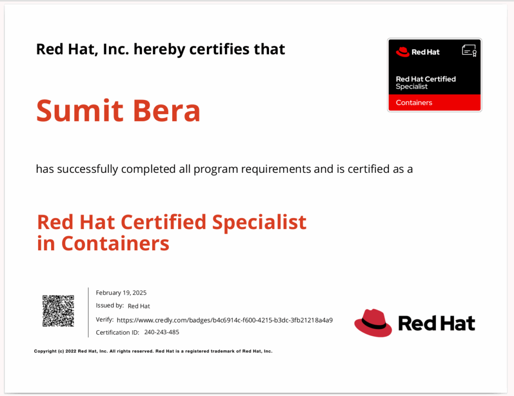 - ✅ Red Hat Certified Specialist in Containers(Certified)