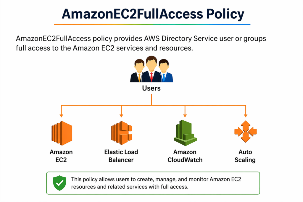 AmazonEC2FullAccess is an AWS IAM policy that gives a user or group full access to Amazon EC2 and its related services.