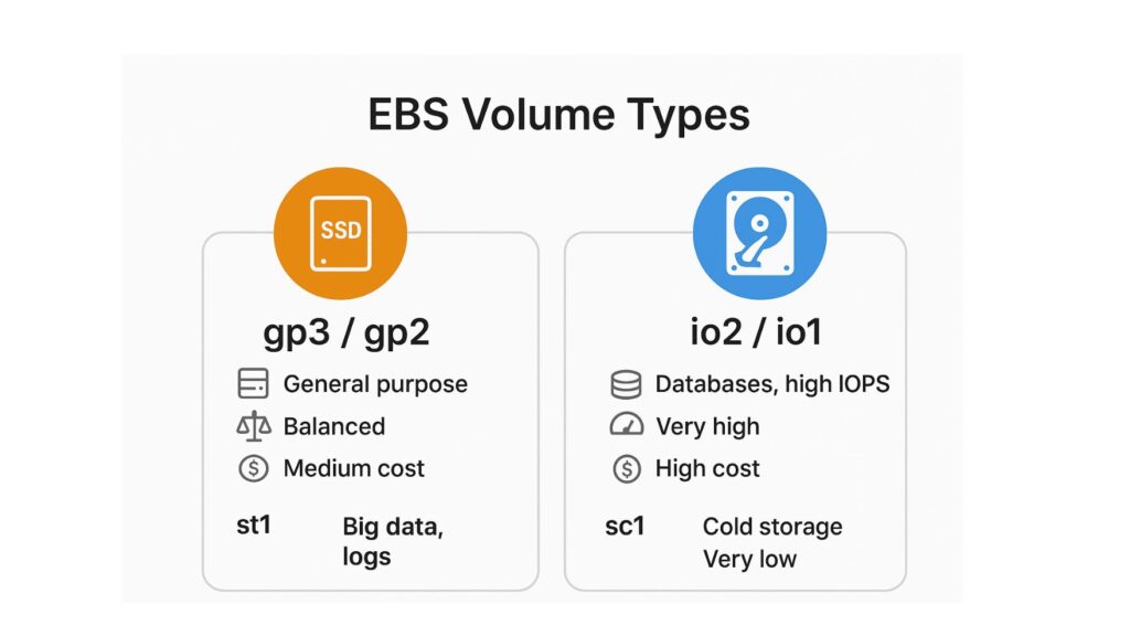 AWS offers different EBS volume types based on performance and cost.
